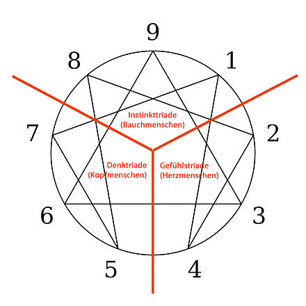- HERZENTRUM (Gefühlstriade) – das sind die Enneagrammtypen 2, 3 und 4, weil diese Enneagrammtypen sich in erster Linie nach ihrem Gefühl richten